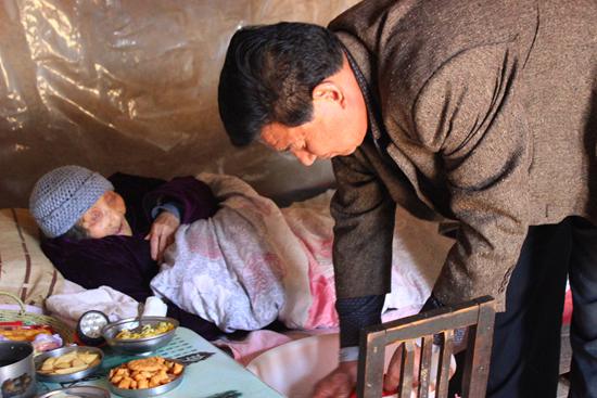王金星的岳母尤何氏97歲,老伴去世早,育有五個(gè)閨女,一個(gè)兒子,是一位經(jīng)歷過太多苦難的老人:兒子不到二十去世,老人一下子失去了精神支柱,天天以淚洗面,一病不起,五個(gè)閨女其中兩個(gè)也相繼去世,現(xiàn)在的三個(gè)女兒一個(gè)在東北,一個(gè)在莒南,另一個(gè)就是王金星的妻子,患有股骨頭壞死常年有病在床。因?yàn)殡x老人最近,照顧老人的重?fù)?dān)就這樣落在了王金星身上。