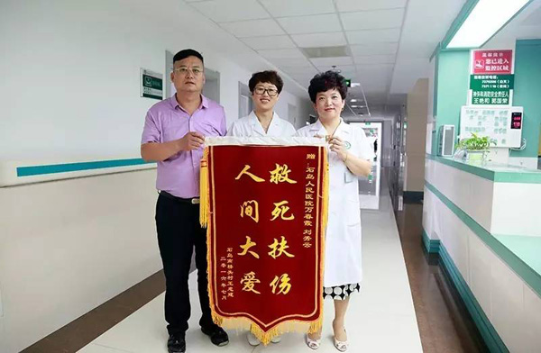 “真是太感謝你們啦,感謝你們在危難之時伸出援助之手救了孩子,你們救死扶傷的精神值得贊揚……”2016年7月4日上午,榮成市石島人民醫院神經外科一名住院患者家屬將一面繡有“救死扶傷,人間大愛”的錦旗送到了電生理科主任萬春霞和醫生劉秀云手中,并表達了深深的謝意。原來,就在幾天前晚上,萬春霞和同事劉秀云在散步時遇到了一起嚴重車禍,她們在現場對傷者進行了初步救治并撥打了急救電話,將傷者送往醫院搶救,挽回了一個年輕的生命。