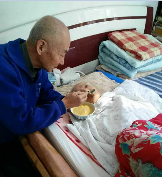 每天凌晨三點,程衍英就起床開始一天的忙碌。先到隔壁房間查看弟弟有沒有尿床,再回來給老伴換尿布、擦洗身體。收拾停當,他趕緊到廚房準備早飯,擔心飯涼了,老人多年來養成了習慣:飯做好后先喂弟弟和老伴,然后自己再吃。喂飯時,程衍英要努力把老伴抱到胸前,再一勺一勺的把飯喂到妻子嘴里。因為妻子大腦萎縮,大腦不反應,飯熱了又涼,涼了再熱,喂一次飯有時要兩小時。