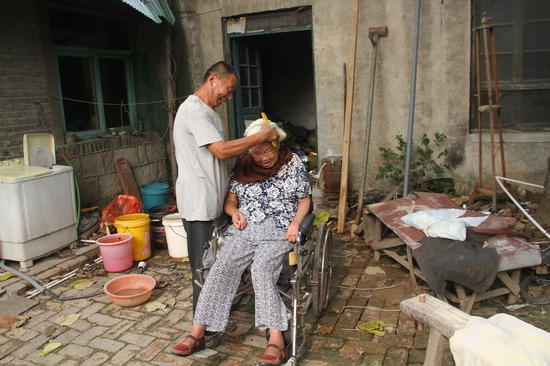 他知道妻子不愿老在屋里呆著,天氣好的時候,每天下午他都會用輪椅推著妻子到村里轉(zhuǎn)一轉(zhuǎn)。妻子比他要重10多斤,要想為不能動的妻子穿好衣服、攙扶坐起來,他用盡全身的力氣還感到吃力。但為了讓妻子開心,他覺得一切都是值得的。張宜茂說,村里像妻子這樣因為腦血栓癱瘓的人還有好幾個,但都過了不久就去世了。妻子在癱瘓以后能夠健康快樂的生活,與張宜茂的細(xì)心照顧和精神的陪伴是分不開的。