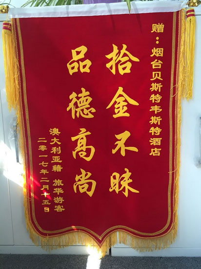據了解,失主發現自己錢包不見后,一直以為錢包落在了媽媽家中,因此沒有主動聯系酒店。當她接到酒店的電話時驚喜萬分,拿到錢包后,一珠女士堅持要拿出酬金答謝姜文紅和酒店,被姜文紅婉言拒絕了。無奈之下,一珠女士委托煙臺的朋友制作了“拾金不昧 品德高尚”錦旗表達謝意。在姜文紅本人看來一個最平常不多的舉動,卻真正見證了一個不染塵埃的靈魂。也見證了他一顆金子般的心,詮釋著誠信的真諦。