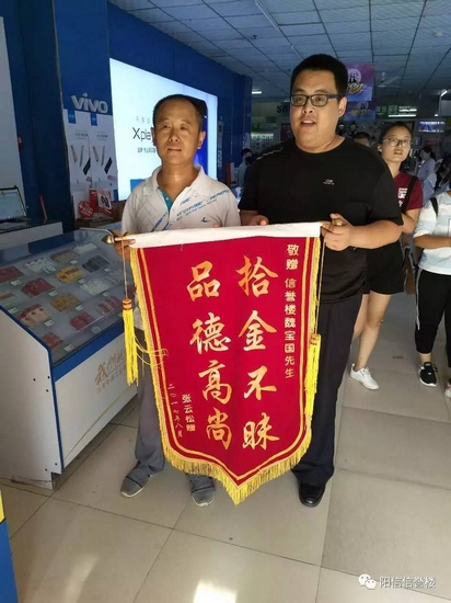 而此時(shí),焦急的失主也發(fā)動(dòng)了各種關(guān)系在微信上轉(zhuǎn)發(fā)尋物啟事,剛好魏寶國(guó)在一個(gè)戰(zhàn)友群里看到了戰(zhàn)友轉(zhuǎn)發(fā)的尋物啟事。魏寶國(guó)立即聯(lián)系上失主,送還了手包和現(xiàn)金。能把這么多現(xiàn)金找回來(lái),失主很激動(dòng),當(dāng)即拿出現(xiàn)金表示感謝,卻被魏寶國(guó)婉言謝絕。2017年8月3日下午,失主為魏寶國(guó)送來(lái)了繡有“拾金不昧 品德高尚”的錦旗,以表達(dá)自己的感激之情。