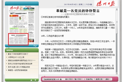 提起德州市市區國家稅務局局長劉衛東,無論是同事還是納稅人,與他接觸過的人,幾乎都對他作出肯定的評價。工作中,他是一名好干部,參加工作33年勤勤懇懇,各項考評均位居前列。工作之外,他是一個好人,19年來堅持無償獻血、捐助失學兒童……用實際行動踐行了一名黨員的錚錚誓言。