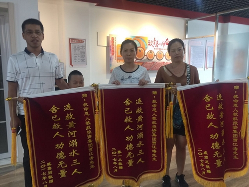 2017年8月23日,賈江濤和同事到黃河邊游玩時突然聽到不遠處有人大喊救命。賈江濤趕緊跑下觀景臺,朝岸邊飛跑,看到三名落水者隨著河水起伏,脫下衣服就跳了下去。他先把離他近的兩個小男孩救上岸,又趕緊跳入水中去救第三個人。“救第三個人時,難度大了些。”賈江濤回憶說。第三位被救的是一位青年女子,比孩子重很多,且因為在水里待得時間久了,意識也已經開始模糊。加上離岸邊越遠,水流越急,連救兩人的賈江濤已經感覺喘不過氣來,但他毫不畏懼,在水中夠到落水女子的手后,便死命抓住,使出全力拼命劃水,終于將第三個人也救到了岸邊。
