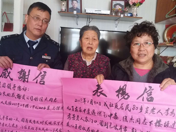 李秀英和秦云盛被徐杰等鄰居們護(hù)送到醫(yī)院,趕來的鄰居們都幫忙跑前跑后,徐杰還幫忙墊付了2千多元的醫(yī)藥費(fèi),還幫忙買來被褥取暖。徐杰等人回到家中已經(jīng)下午4點(diǎn)多,“大家都在忙活,沒顧上吃飯,從醫(yī)院出來時,還是徐杰帶著我們?nèi)コ粤孙垺!庇诠鹩⒔榻B說,平時大家的感情就特別好,你家有困難我?guī)鸵话眩慵矣欣щy我伸出援手,取暖費(fèi)收費(fèi)地址換了也是徐杰帶著于桂英去繳費(fèi),于桂英和李秀芳都把徐杰當(dāng)?shù)艿芎秃⒆涌创依镉辛撕贸缘囊膊煌衼硪黄鸱窒怼?月12日,市北區(qū)阜新路街道阜康社區(qū)宗德珍主任和居民于貴英一同帶著表揚(yáng)信和感謝信來到公交集團(tuán)嶗山巴士第六分公司,要感謝分公司安保人員徐杰,多虧徐杰救了煤氣中毒的社區(qū)居民李秀芳一家三口。