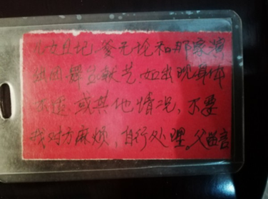 這是一張表面微微泛黃、有點磨損的自制“小紅卡”,在正反兩面的紅色紙上,寫著同樣的43個字: “兒女切記,爹無論和那家演出團舞臺獻藝,如出現身體不適或其他情況,不要找對方麻煩,自行處理。父留言。”