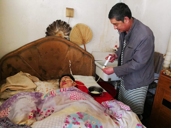 為了照顧妻子,劉景明向單位提出了提前退休的申請,從此,劉景明便把全部身心放在了照顧妻子身上。每天一大早,劉景明便起來做飯,用攪拌機把飯打碎,用針管打到胃管里給楊淑芳喂飯,僅僅吃一頓飯,就要花費兩個小時的時間。每隔兩個小時,劉景明還要給楊淑芳翻一次身,給她按摩一下松松筋骨,半夜里,還要起身給楊淑芳喂水,清理臟污物。為了更好的照顧妻子,劉景明每天休息的時間不超過兩個小時。漸漸地,劉景明也沒有了時間的概念,只能分辨出白天和黑夜。有時熬不住了也會默默嘆口氣,然后轉(zhuǎn)身換上笑容,繼續(xù)數(shù)十年如一日的生活,就這樣他把自己的生活全部給了妻子。
