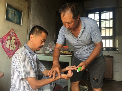 今年50歲的于春海,從生下的那一天起,生活便是無比的簡單,由于遺傳和治療不及時(shí)的緣故,于春海的智力一直停留在一個2、3歲的小孩子水平,缺乏對生活最基本的認(rèn)知,除了吃飯之外,日常生活基本離不開人的照顧。每天就是吃飯和坐著,同時(shí),還患有嚴(yán)重的皮膚病和乙肝,需要藥物治療。而在劉明舉的生活里,除了日常工作之外,便只剩下陪伴著于春海。于春海全身患有嚴(yán)重的皮膚病,需要藥物治療。前幾年家庭生活比較拮據(jù),劉明舉求爺爺告奶奶,向別人求到了對于一般家庭還是很廉價(jià)的治療皮膚病的藥物,每天幫于春海進(jìn)行全身的涂抹。不管嚴(yán)寒酷暑,兩個人都要坐在家里為了“涂藥”這個事進(jìn)行一番抗?fàn)帯S捎谄つw病,每次涂藥的時(shí)候,于春海都因?yàn)槠つw接觸而疼得發(fā)狂。隨著歲數(shù)的增長,劉明舉越來越感到力不從心,每到劉明舉無法將于春明按住的時(shí)候,兩個大老爺們便抱在一起哭一會兒,你埋怨我一陣,我罵你一陣,然后等疼痛消弭之后繼續(xù)下一輪的抗?fàn)帲@一抹便是20多年。