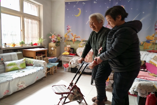 有時候滿鳳云在睡覺,胡玉華也會慢慢嘗試著下樓,滿鳳云起來之后找不到她,就知道她下樓了,會立刻在窗口看著,等老人回來趕緊扶她上來,一邊扶還一邊埋怨她為啥不叫自己。每當這個時候,胡玉華就在旁邊笑。