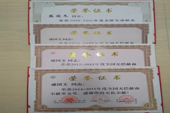 盛國文經歷了40年的獻血歷程,202次無償獻血,共獻血96400毫升,影響帶動了400多人參加到無償獻血中去,志愿服務累計近4000多小時,四次榮獲“全國無償獻血奉獻獎金獎”,兩次榮獲“全國無償獻血志愿服務獎五星獎”。
