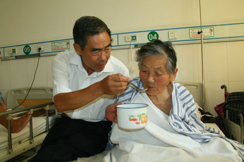 自從妻子生病住院后,謝照乾每天都是盡心盡力的照顧著躺在病床上的妻子。端起桌上的水杯,嘗嘗溫度,再輕輕湊到妻子嘴邊,喂其喝下,擦擦嘴,掖掖被角,繼而開始為她活動胳膊捏腿,按摩身體。一年多的時間里,他每天幾次都重復著這些動作,盼望著她盡快好起來。