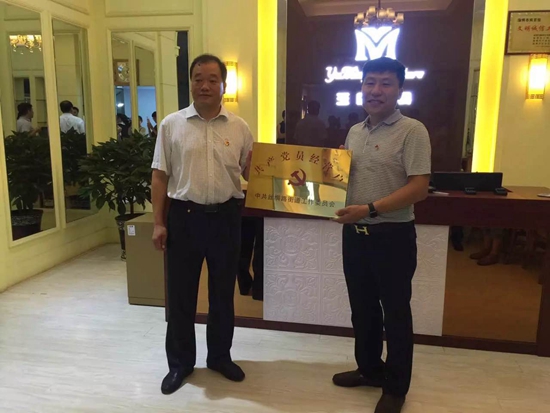 2016.7.12耿玉明(右) 接受周村區(qū)絲綢路街道蘇書記為公司頒發(fā)的“共產黨員經營戶”牌匾