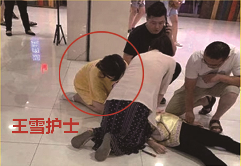 2019年8月18日周日晚上,王雪和家人去商場就餐時,聽到鄰桌小女生告訴她媽媽“外面有人暈倒了!”。王雪立刻出去查看,當時見一名女子平躺在地上,王雪解釋自己是一名護士,便立即靠近女子了解情況,當時已觸不到女子的頸動脈,她讓工作人員撥打120,并立即對女子進行胸外按壓。