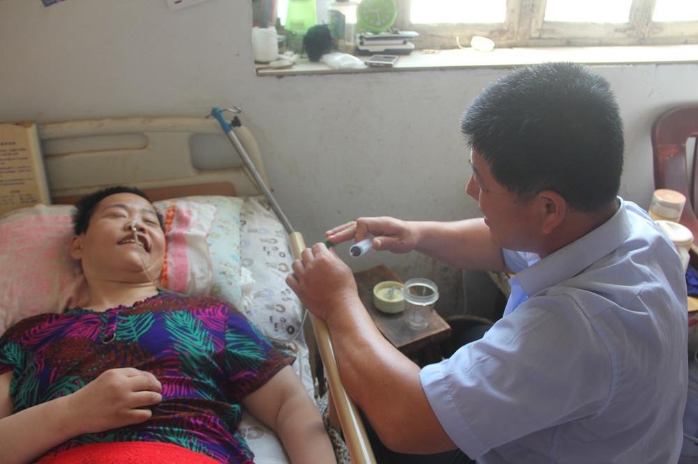 每天早晨起床,李俊明要做的第一件事就是用豆漿機做米糊,因為妻子只能通過從鼻孔插進胃部的導管進食流體食物,然后給妻子洗手擦臉。他知道妻子愛干凈,只要尿布濕了他就換下來再換新的。只有下地干活、外出有事才給妻子穿尿不濕。為了方便照顧妻子,李俊明自己學會了給妻子換導管,每個月都要去醫院購買新的導管回來為妻子更換。6年來,李俊明天天如此,每天為妻子翻身、按摩,癱瘓在床的妻子從沒有得過褥瘡。