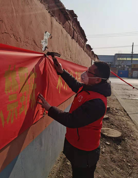 疫情知識宣傳、群眾安撫勸導是防控的基礎工作,但是迓莊村里許多老人不會用智能手機、不了解疫情的發展情況,趙劍就和村干部一邊入戶核查人員往來情況,一邊宣傳防護措施和告知最新疫情,叮囑村民要注意衛生、不要串門。為此,趙劍走遍了村子里的大街小胡同,只為將疫情防控知識傳達給每一位村民。與此同時,趙劍還充分運用村內喇叭、全村微信群廣泛宣傳疫情防控倡議書、疫情通告、病毒防控指南等材料,在村內顯著位置懸掛起一道道橫幅、張貼倡議書。村民看到第一書記沖鋒在前,恐慌緊張的心情也就平復下來。趙劍和迓莊村“兩委”第一時間成立了疫情防控工作小組,組建了迓莊村抗擊疫情志愿服務隊。在村內各個路口設立了疫情防控檢查站,他和村干部帶頭值守在檢查站,對進出村人員和車輛進行嚴格管控和登記,入村人員逐個測體溫,車輛逐個進行消毒處理。為了盡最大所能防止疫情,趙劍和志愿者用84消毒液及時對村內小賣鋪、衛生室、廣場健身設施等進行徹底的消毒工作,確保掐斷病毒進入村莊的源頭,為迓莊村構筑起了群防群治的嚴密防線。