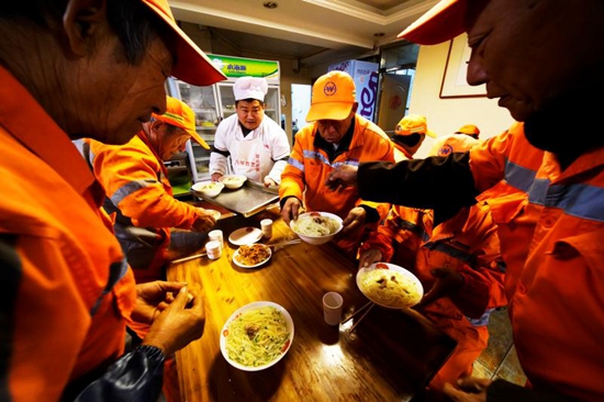姜常論為環(huán)衛(wèi)工人提供免費早餐、熱水