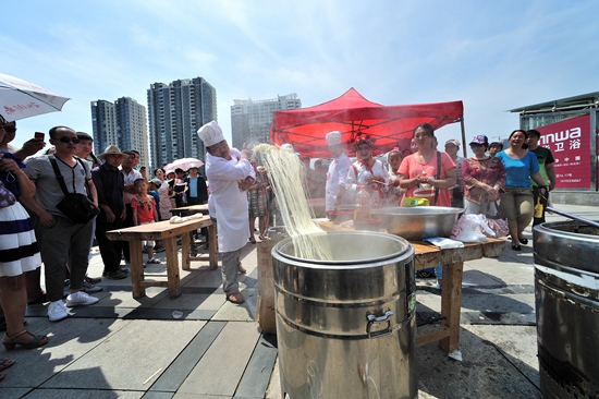姜常論在展示煙臺市非物質(zhì)文化遺產(chǎn)——郭城摔面的制作過程