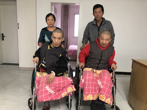 “以前冬天沒暖氣,兩個孩子不能活動怕冷,我給他們每個人都做了30多條棉褲,每天棉褲都像棉被那么厚。他們大小便都不能自理,經常把棉褲、被褥弄臟,我每天給他們換幾條、經常拆洗,但就是這樣,兩個孩子的腿上凍得都是黑色的泡。”提起這些,周素真難掩心酸。“前年我們回遷到花園社區了,冬天有暖氣,孩子也沒那么受罪了!闭f到這里,她又笑了起來!昂⒆娱L大了,我歲數也越來越大,已經抱不動他們了,以后我們歲數大了,可能照顧他們就更難了!敝芩卣嬲f。