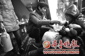 13日晚,濟南救助站工作人員帶著棉衣和溫熱的食物奔波在濟南的大街小巷,送給不愿到救助站的流浪人員。圖為花園路上,一位流浪的老人接過工作人員遞來的一碗熱粥! ”緢笥浾摺£愇倪M 攝