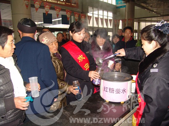 濟南廣場汽車站工作人員為因雪滯留的旅客贈送紅糖姜水。通訊員 朱閣琳 攝