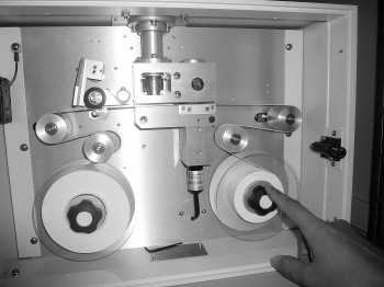 ▲設備里的紙帶上每隔一小時就會打上一個黑點,就能分析出這一個小時里空氣PM2.5的濃度!    (記者 李萌博 攝)