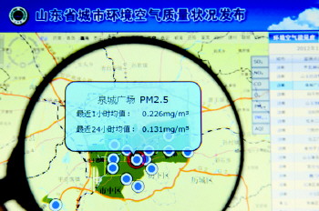 12月20日上午8點半,打開山東環(huán)境網(wǎng)站(http://www.sdein.gov.cn/),點擊右下方一個醒目的藍色標志——“山東省城市環(huán)境空氣質(zhì)量狀況發(fā)布”,一張山東地圖便浮現(xiàn)在眼前,任意選擇一個城市,放大后即可看到若干不同顏色的圓點,這就是該市的空氣環(huán)境監(jiān)測點位,移動鼠標,即可查閱該監(jiān)測點最近24小時的AQI(空氣質(zhì)量指數(shù))、空氣質(zhì)量等級、出行建議及PM2.5等6項具體指標的實時監(jiān)測數(shù)據(jù)。