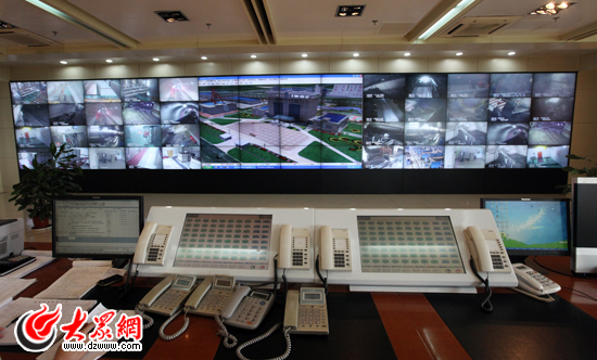 安全生產指揮中心內巨大的顯示屏可以監視井下及廠區內各處的情況。(盛堃 攝影)