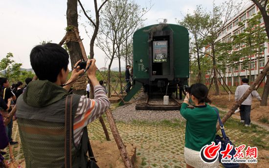 秋季落葉不掃,路面中間綠化帶野花盛開。西山封山育林,形成一片生機盎然的“自然保護區”,校園南面的綠意“濕地”。記者們和學子們愜意地走在樹影婆娑、涼風習習的校園里,沿路欣賞著雕塑與創意設計,一覽四架“殲六”戰機及軍艦導彈的風采,讓人回顧起百年青島工業歷史;或坐在綠皮火車車廂改裝成的商店咖啡館愜談,坐在林下橫躺的樹干上閱讀,不入課堂就能得到青島工業文化的熏陶。
