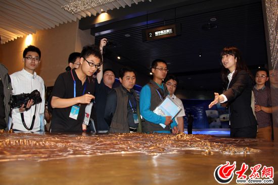 采訪團參觀威海市市民文化藝術中心里的規劃館。(馬鑫 攝)