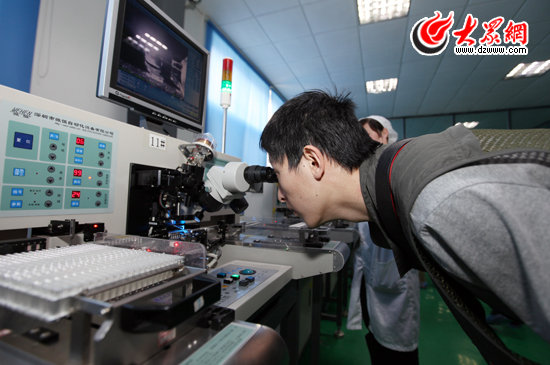 通過顯微鏡觀看生產(chǎn)中的細微之處。(盛堃 攝影)