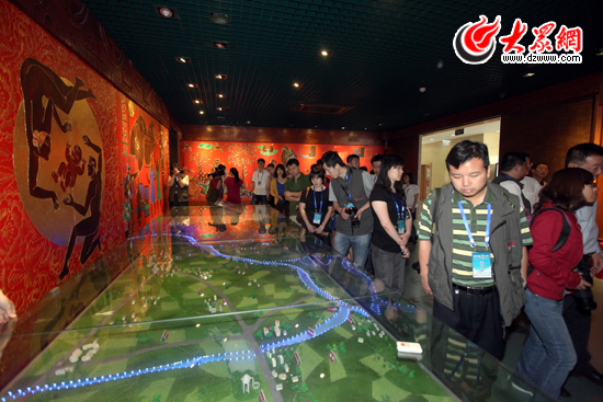 采訪團記者參觀采訪中國阿膠博物館內(nèi)的阿膠水源模型。(盛堃 攝影)