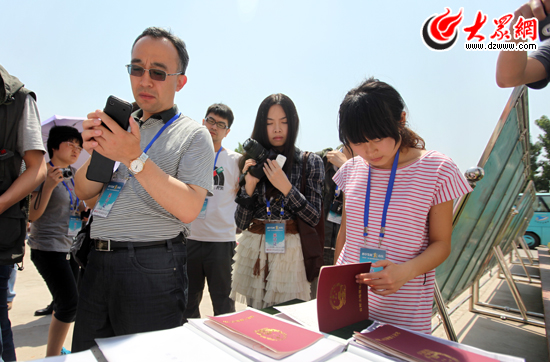 采訪團記者翻閱《農村土地使用產權證》。(盛堃 攝影)