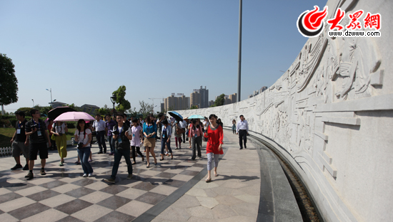采訪團記者參觀采訪東湖公園內的文化墻。(盛堃 攝影)