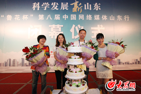科學發展新山東——“魯花杯”第八屆網絡媒體山東行閉幕儀式上,主辦方為5月份過生日的采訪團成員慶生。(盛堃 攝影)