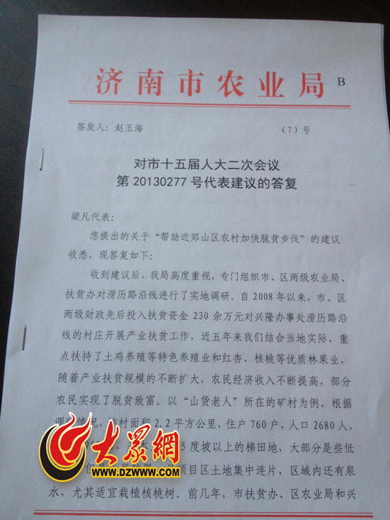 大眾網(wǎng)記者注意到,這份《答復(fù)》材料中還寫道:“市農(nóng)業(yè)局、市扶貧辦將進(jìn)一步加大對(duì)市中區(qū)尤其是澇歷路沿線村莊的扶貧支持力度,幫助貧困村民發(fā)展致富產(chǎn)業(yè)、項(xiàng)目,夯實(shí)脫貧致富的產(chǎn)業(yè)基礎(chǔ),力求從根本上實(shí)現(xiàn)脫貧。”