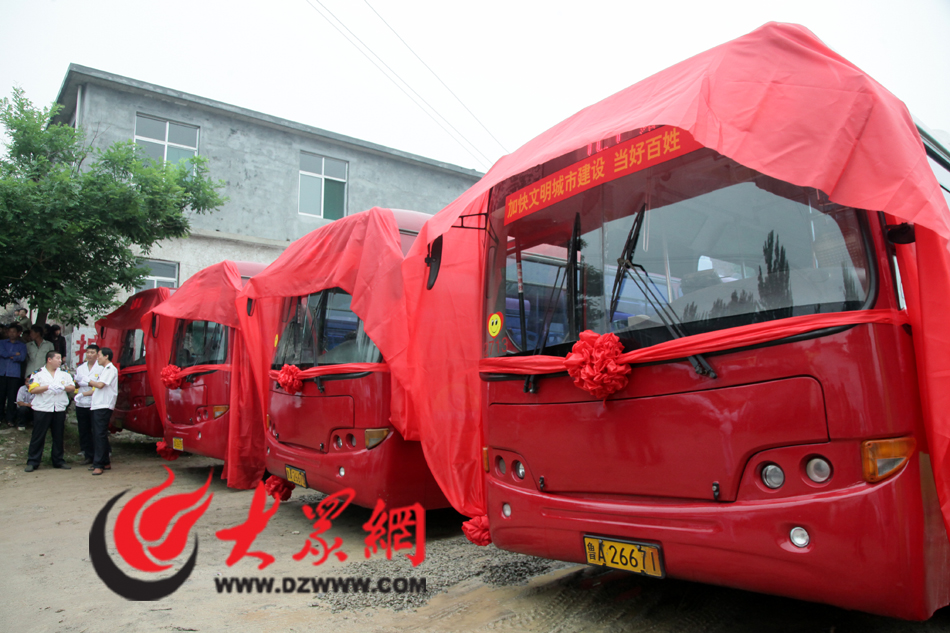 一身紅裝的公交車像新娘子一樣,帶著大紅花,披著“紅蓋頭”。