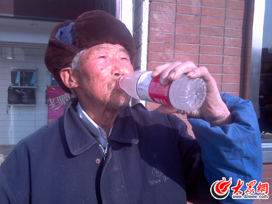 老人從家里帶來的水已經冰涼了,但依然能解渴。(韋輝 攝)