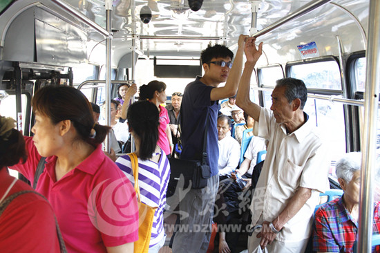 今天上午從重汽技術中心發出的第一趟試運行班車上,剛走出兩站路,車上就坐滿了乘客。記者 張帆 攝