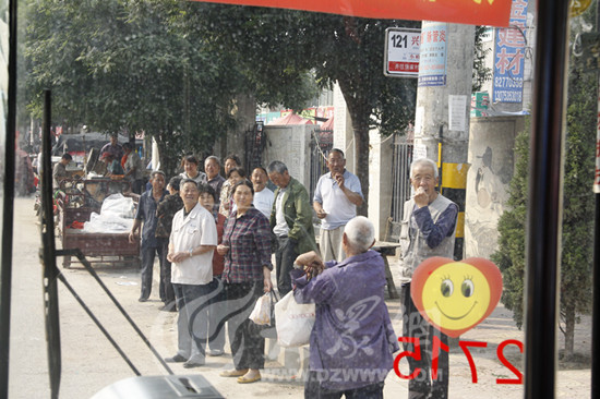 今天是121路公交車試運行的第一天,很多乘客早早地等候在了公交站牌處。記者 張帆 攝
