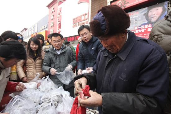 前來采購的熱心市民和網(wǎng)友讓寒冷的天氣變得溫暖:56歲的李阿姨帶來了馬扎,主動(dòng)維護(hù)秩序、裝袋;28歲的林翔帶著朋友,從天橋區(qū)開車專門來買貨;正在讀研的馬偉瀚帶來一大杯熱水,為“山貨大爺”驅(qū)寒;六乃喜快餐店還專門為老人安排了午飯,為活動(dòng)制作了大幅海報(bào);山東大學(xué)MBA聯(lián)合會的6名會員中午1:00就來到了現(xiàn)場,一直幫著“山貨大爺”裝貨、賣貨,他們不僅買了20多斤山貨,還贈(zèng)送給了“山貨大爺”一個(gè)精致的水杯。