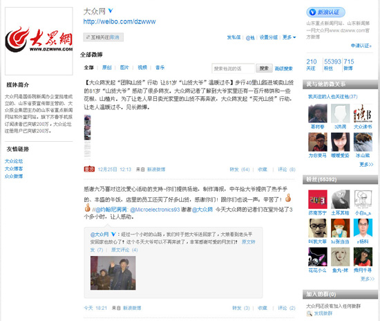 大眾網(wǎng)濟(jì)南12月27日訊記者 劉欣)55條原創(chuàng)微博、300余條微博評(píng)論、600余次微博轉(zhuǎn)發(fā)……這些數(shù)字是大眾網(wǎng)友們愛(ài)心的見(jiàn)證!今天,大眾網(wǎng)官方微博@大眾網(wǎng) 對(duì)愛(ài)心“團(tuán)購(gòu)山貨”活動(dòng)進(jìn)行了全程微博直播,近100位網(wǎng)友通過(guò)微博號(hào)召大家購(gòu)買(mǎi)愛(ài)心山貨,傳遞網(wǎng)絡(luò)正能量。