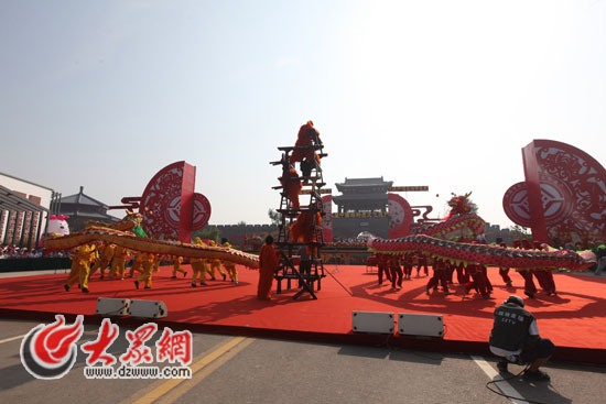 領導和嘉賓入場后,《魯南鼓吹樂》首先在主會場奏響。配合著歡快的鼓點和嗩吶演奏,被稱為“華夏一絕”的山西臨汾天塔舞獅躍上舞臺,喜慶的鼓樂和精彩的舞獅讓現場觀眾叫好不斷。緊接著,有“東方一絕”之稱的浙江永康《九獅圖》壓軸登場,11位藝術家用38條20多米長的纖繩,操縱著九只獅子和一個彩球在空中飛舞,演繹了九獅狂歡、獅子銜球的絕技,營造出激情歡樂的喜慶氣氛。