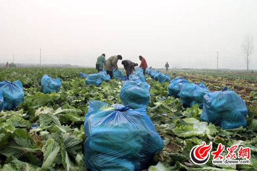 早上6點,菜農們便開始“收拾”大白菜,將干干凈凈的白菜裝袋運出菜地。