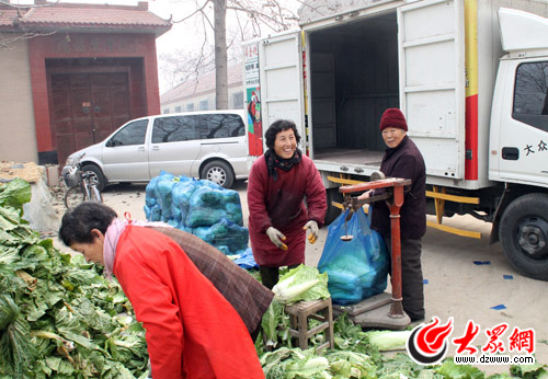 大眾網濟南11月26日訊(記者 尹海洋)又到周末,愛心繼續!皬埥ò布6100斤,王玉琢家5000斤,劉配華家3500斤……”今天上午,唐王鎮南殷村7戶菜農的37000斤大白菜終于“名菜有主”了。來自大眾報業(集團)發行有限公司的10輛汽車來到地頭,收購了37000斤愛心大白菜,這使得南殷村7戶菜農從中受益。