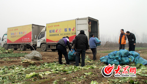 昨天,大眾報業(集團)發行有限公司收購了唐王鎮南殷村7戶菜農的3.7萬斤大白菜,而這些只是該公司“團聚愛心 傳遞真情”愛心活動的一部分。今天上午,6輛汽車再次來到南殷村,將之前預定的1.6萬斤愛心菜拉走。
