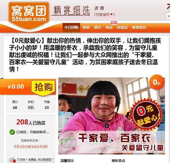 隨后,在大眾網、濟南嬰貝兒母嬰購物廣場、山東公益發起“千家愛、百家衣”活動后,上月28日,“窩窩團”濟南分站也在其網站首頁及時貼出了“0元獻愛心”的團單。短短一周多的時間,便有20余位愛心人在網上團購了愛心,并把棉衣、棉鞋、書包、玩具等60余件愛心衣物送到了“窩窩團”濟南分站辦公地點。