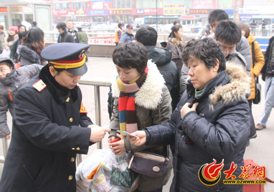 馬上要過春節(jié)了,很多家在外地的人都抓緊最后的時(shí)間搭上回家的列車。但與前幾天相比,濟(jì)南火車站的人已經(jīng)減少了很多。記者1月20日上午9點(diǎn)來到進(jìn)站口時(shí),發(fā)現(xiàn)并沒有想象中的人山人海的場(chǎng)景。在車站門口服務(wù)臺(tái)工作的程老師告訴我們,今天上午的進(jìn)站高峰已經(jīng)過去。早上6點(diǎn)時(shí),進(jìn)站人數(shù)達(dá)到了一個(gè)小高潮。“現(xiàn)在人已經(jīng)少一些了,驗(yàn)票同事的工作能輕松一點(diǎn)。到10點(diǎn)左右人數(shù)又會(huì)變多。”程老師介紹說!斑@兩天氣溫比較低,加上春運(yùn)人數(shù)這么多,不少驗(yàn)票的同事都帶著感冒輪班的!