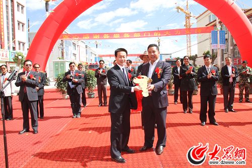山東援藏干部領隊、日喀則地委副書記張寧波(左)向日喀則市負責人遞交了象征該項目竣工的鑰匙。