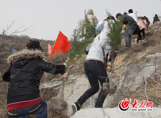 網友們攜帶樹苗艱難的爬山
