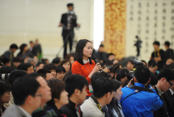 2012年3月2日15時,全國政協十一屆五次會議新聞發布會在人民大會堂三樓金色大廳召開,大會新聞發言人趙啟正向中外媒體介紹本次大會有關情況,并回答記者提問。圖為中國日報記者提問。陳競超 攝
